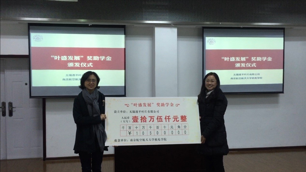 2015年11月26日上午10点色情动漫 在明故宫校区举行2014-2015年度 “叶盛发展”企业奖助学金发放仪式。设立单位无锡透平叶片有限公司人力资源与党群部陈纯部长、人力资源部孙珂、色情动漫 党委副书记许赞、各年级辅导员以及获奖学生代表出席了会议。