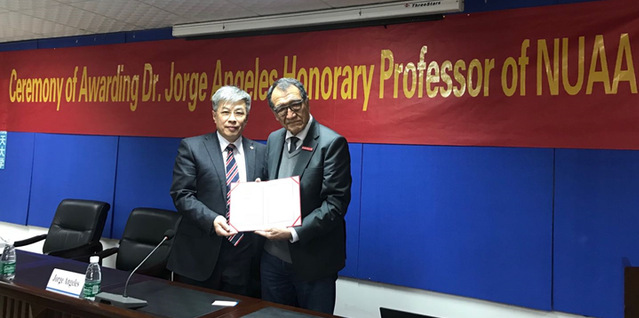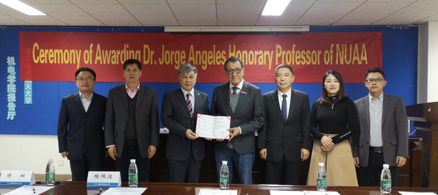 授予仪式由国际合作处主任沈敏主持,色情动漫 院长傅玉灿向与会人员介绍了Jorge Angeles教授的简历,校长助理熊克为Jorge Angeles教授颁发名誉教授聘书并佩戴南航校徽。Jorge Angeles教授发表致辞,表达了与南航开展更加广泛密切合作和共同在专业领域做出更多贡献的期待。受聘仪式结束后,Jorge Angeles教授为我校师生作了题为《Form, Reciprocity and Structure in Multibody-system Models》的学术报告。