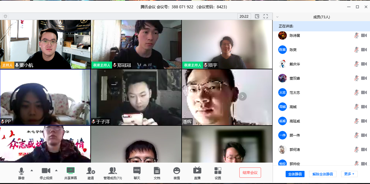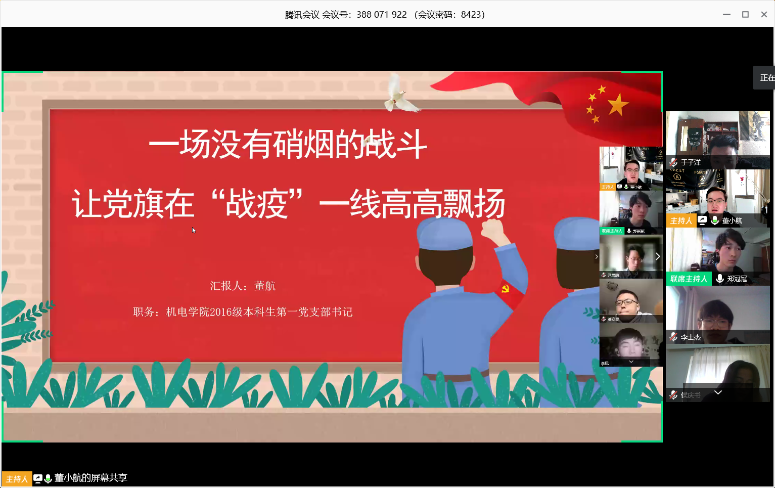 为了按时召开党支部大会,色情动漫 2016级本科生第一、第二党支部联合召开线上党支部大会,特殊时期,特殊办法,我也算是切身体会到了这个观念,党支部76名学生党员加上1名辅导员党支部书记,使得本次会议如火如荼的展开。反观会议内容,第一、第二党支部副书记分别分享了自己在防疫期间的心得感想,党支部书记紧接着给我们上了一堂特殊时期的党课,我个人觉得党支部会议就是让每一位党员的警钟长鸣,提醒每一位党员在不同时期都要牢记自己党员的身份,疫情期间,“党员先行”“党员打头阵”等等话语并不是停留在口号上的,我们学生党员同样是伟大党组织中的一份子,更是党组织中的新鲜血液,做好本职,做好带头,做出榜样,做合格党员!