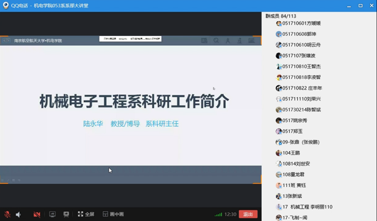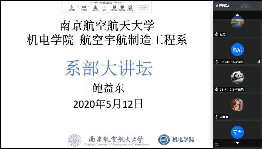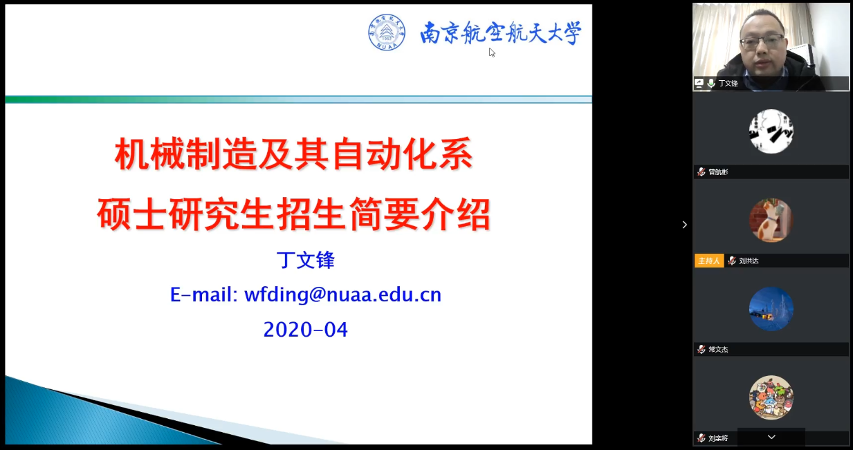 为进一步扩大学科影响,提升学院研究生生源质量,营造浓厚的深造氛围,4月20日到5月12日,色情动漫 2017级成功开展了4次线上系部大讲堂活动。本次大讲堂活动邀请到了设计工程系副主任郭勤涛、机械制造及其自动化系副主任丁文锋、机械电子工程系副主任陆永华和航空宇航制造工程系副主任鲍益东作为主讲人,采用线上会议的方式为色情动漫 学生介绍科研团队、研究方向等内容。本次系列活动由2017级本科生辅导员刘洪达主持。