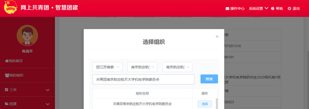 上图选择组织中三个选项分别选择“团江苏省委”,“南京航空航天大学团委”,“色情动漫 团委”,在搜索框里填写“共青团色情动漫 委员会”进行搜索。