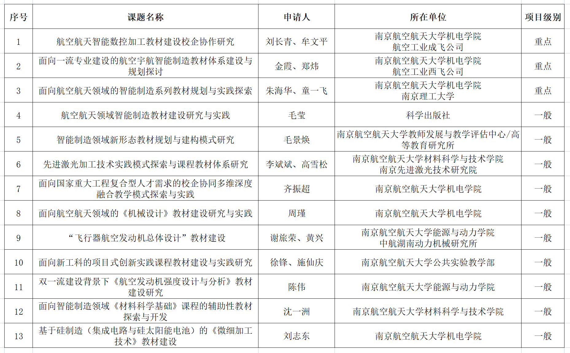 根据《关于发布工业和信息化部“十四五”规划航空航天领域智能制造教材建设重点研究基地开放课题指南的通知》要求,经个人申报,各高等院校、科研院所和重要企业单位推荐,学校专家组评审,拟立项以下13个项目,其中重点项目3项,一般项目10项,现予以公示。排名不分先后,名单如下: