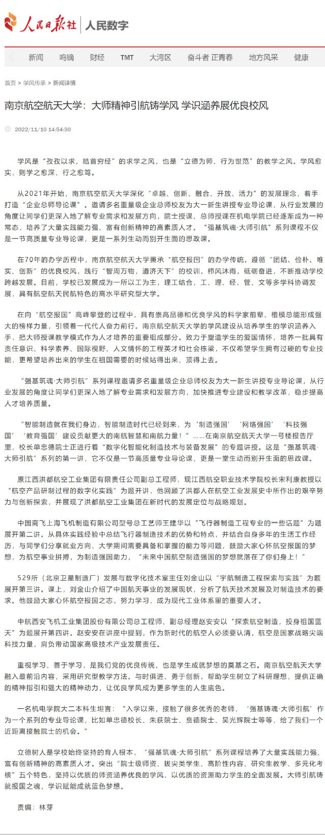 编者按:11月10日,人民日报社-人民数字专栏文章《南京航空航天大学:大师精神引航铸学风 学识涵养展优良校风》报道色情动漫 大师领航、强基铸魂学风涵养工作室工作开展情况,阐述学院不断加强学风引领、展学学院良好学风素养,现转发全文如下: