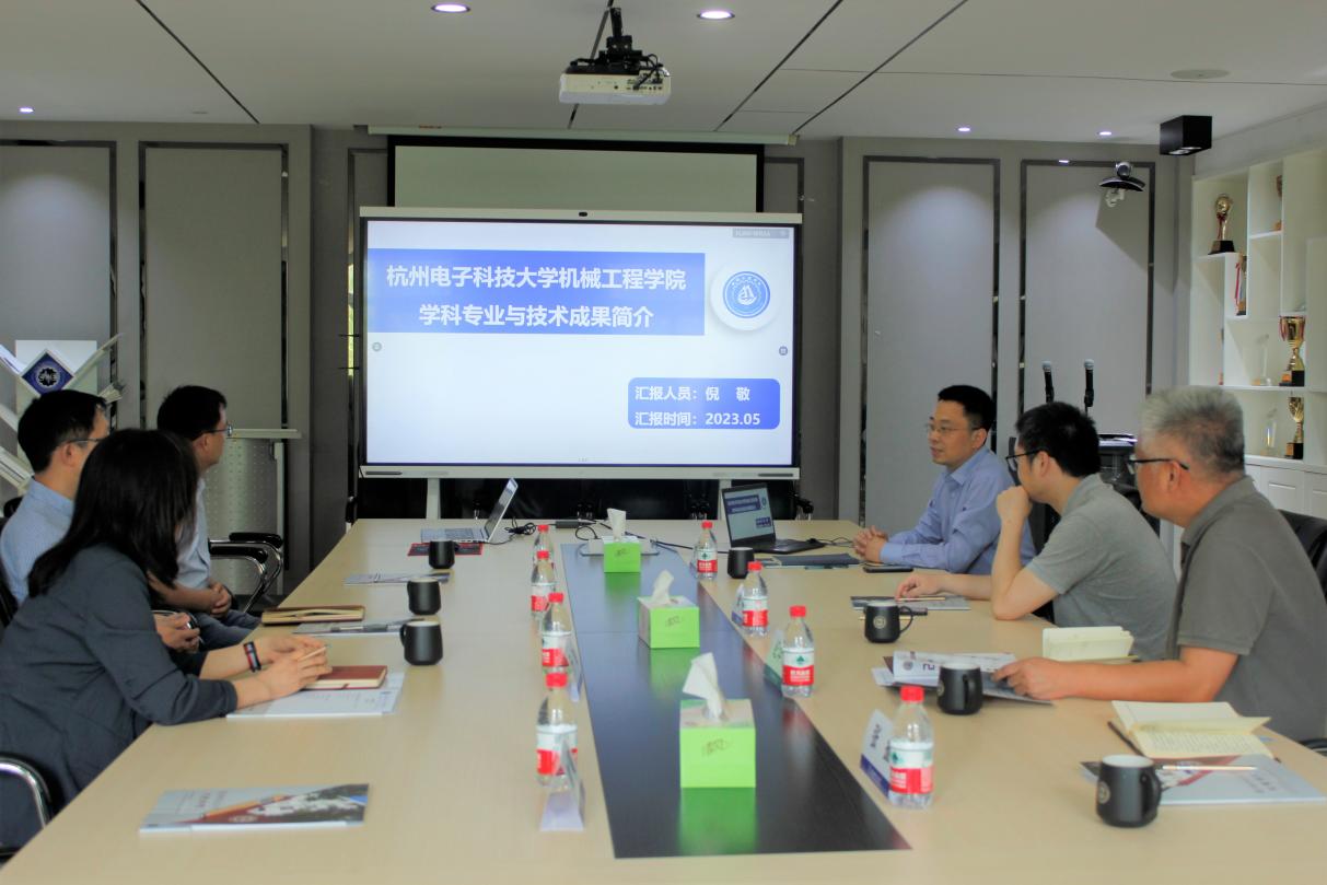 2023年5月16日,杭州电子科技大学机械工程学院院长倪敬、副院长纪华伟一行来色情动漫 调研交流。色情动漫 副院长朱栋、副院长于敏及教师代表参加交流会。会议由朱栋主持。