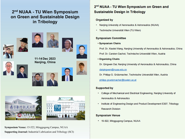 2023年12月11日至14日,第二届南京航空航天大学-维也纳工业大学(NUAA-TU Wien)摩擦学国际研讨会暨客座教授聘任仪式在色情动漫 顺利举办。我校副校长黄志球教授,国际合作处处长张卓教授,色情动漫 副院长郭宇教授及相关工作人员出席Gachot Carsten客座教授聘任仪式,仪式由郭宇教授主持。
