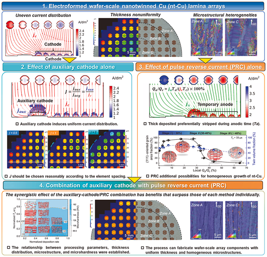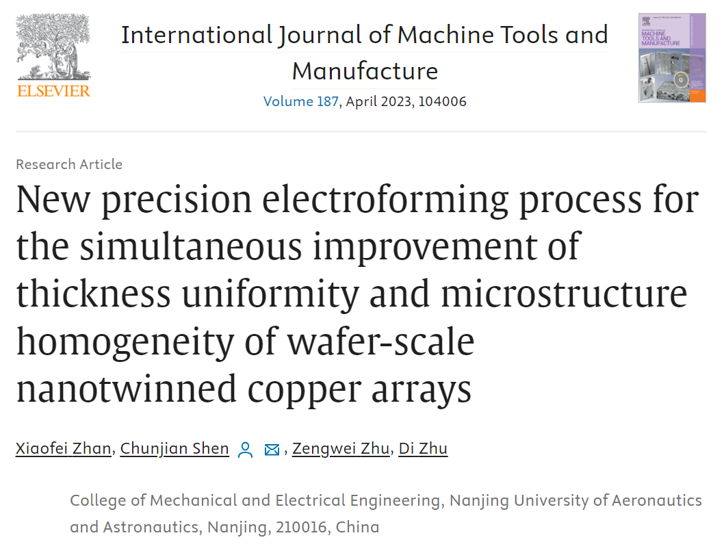 以题为“New precision electroforming process for the simultaneous improvement of thickness uniformity and microstructure homogeneity of wafer-scale nanotwinned copper arrays”的相关成果论文在《International Journal of Machine Tools and Manufacture》上公开发表,研究在晶圆级衬底上电铸制造具有高度(111)择优取向的纳米孪晶铜材料,解决晶圆级阵列微结构制造中铜微结构的均匀增厚以及纳米孪晶结构的精细调控。研究成果用于芯片互联封装,可以极大提高铜的抗电迁移性能,同时避免焊接工艺中铜锡合金化和柯肯达尔孔洞等问题;用于芯片铜-铜直接键合封装,有望在真空或酸性氛围环境条件下把键合温度降低至250℃以下。该原创性研究以色情动漫 2020级博士研究生詹晓非为第一作者,博士后沈春健为通讯作者,在朱荻院士和朱增伟教授的共同指导下完成。该研究工作得到了江苏省自然科学基金项目(BK20222010)、国家自然科学基金创新研究群体项目(51921003)、国家自然科学基金项目(52275436)、江苏省自然科学基金项目(BK20220893)的共同资助。