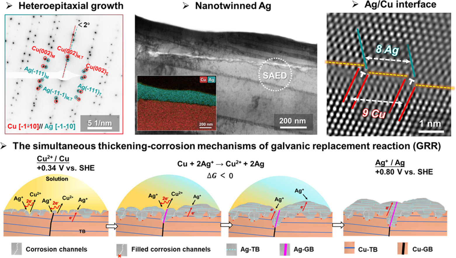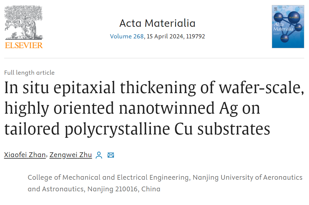 以题为“In situ epitaxial thickening of wafer-scale, highly oriented nanotwinned Ag on tailored polycrystalline Cu substrates”的相关成果论文在《Acta Materialia》上公开发表,在晶圆级衬底电铸纳米孪晶铜表面上,原位外延生长出无过渡层的具有高度(111)择优取向的纳米孪晶银膜。所获得的纳米孪晶银膜成功复制了铜衬底的晶体学信息,表现出局部单晶状和优异的热稳定性。研究成果用于芯片铜-铜直接键合封装,有望在空气环境下实现180℃低温高质量键合,而且与现有的电镀铜制程工艺具有良好的兼容性。该原创性研究以色情动漫 2020级博士研究生詹晓非为第一作者,朱增伟教授为通讯作者。该研究工作得到了国家自然科学基金项目(52275436)和江苏省自然科学基金项目(BK20222010)的资助。