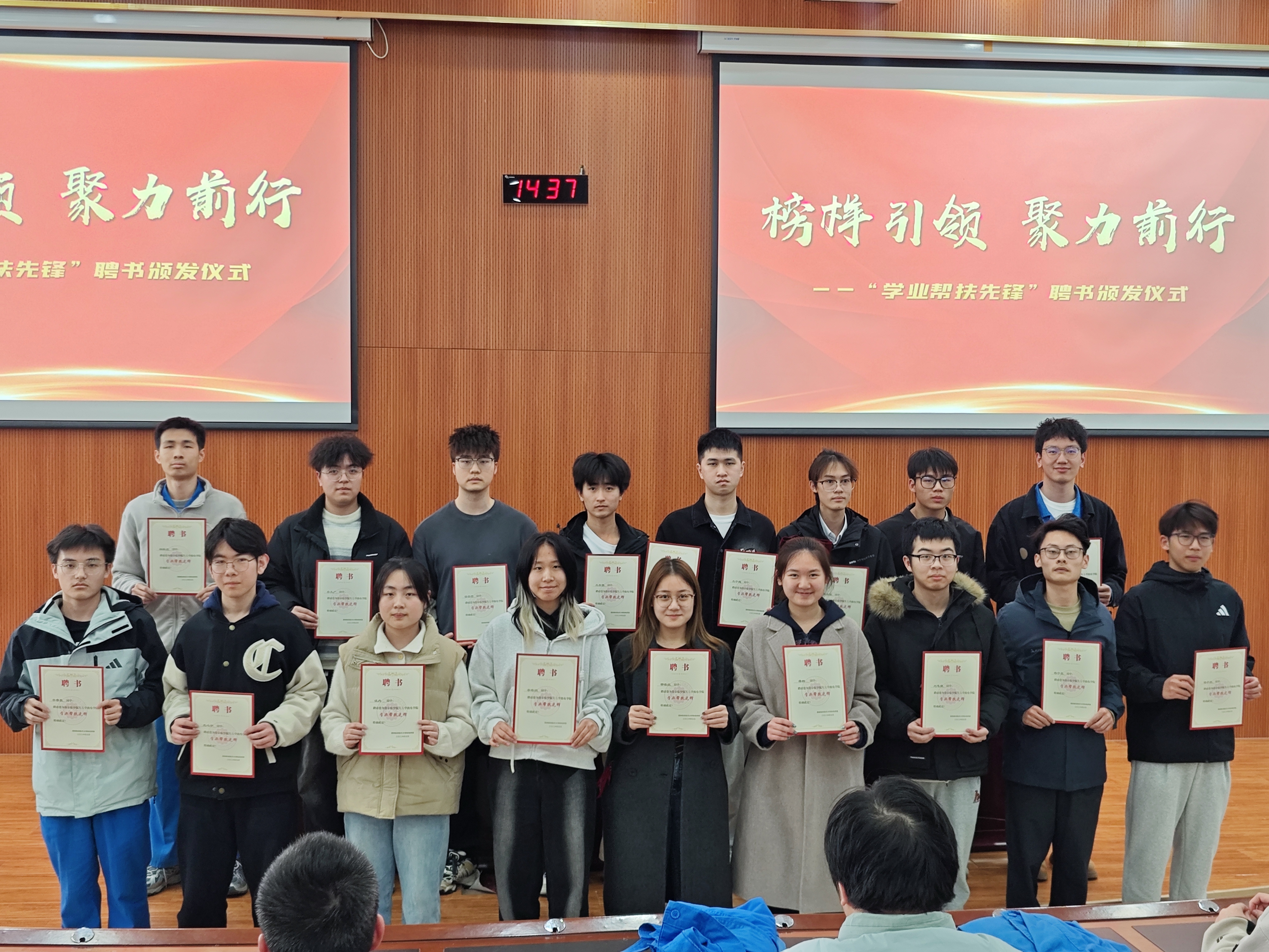 随后,举行“学业帮扶先锋”聘书颁发仪式,旨在搭建学业互助平台,树立勤学善帮的榜样标杆,进一步推动年级形成“比学赶超帮”的优良学风,以朋辈力量为学业薄弱同学提供精准助力,实现全体同学的共同进步与成长。